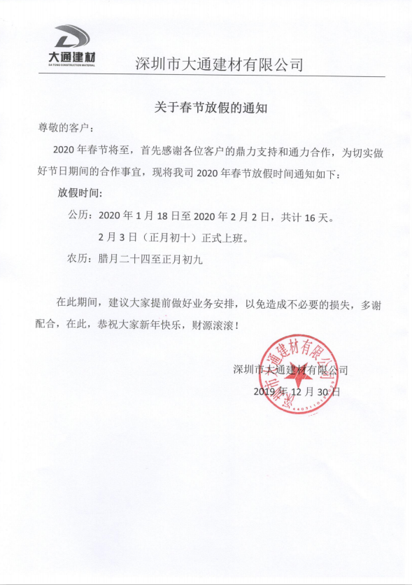 - 深圳市大通建材有限公司“2025年春節”放假通知2025-01-08