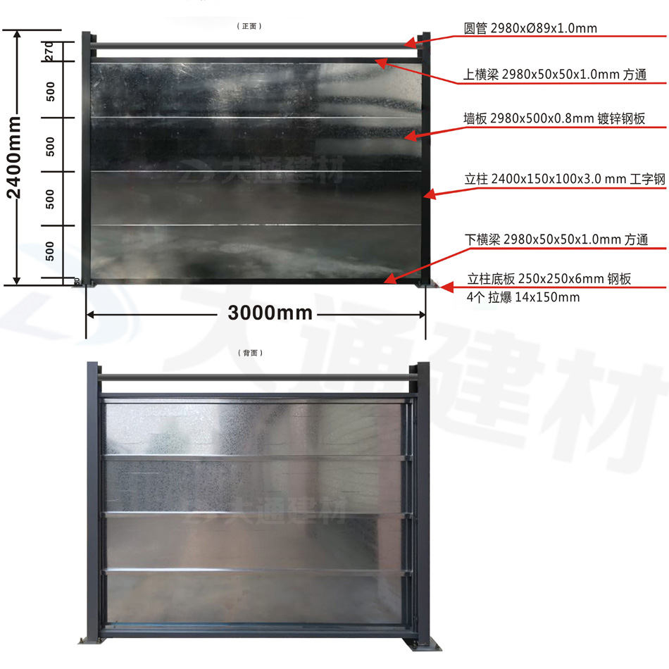 工字鋼圍擋C類鍍鋅板2.4米高無帽款 規格參數 如上圖展示