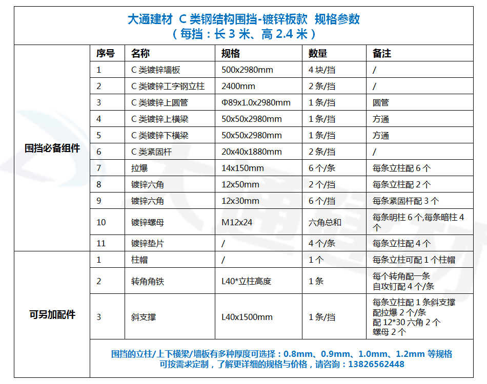深圳大通建材C類裝配式鋼圍擋-鍍鋅板款通常作為圍墻護(hù)欄使用,起隔離防護(hù)作用。常規(guī)一擋的長(zhǎng)度是3米、高度是2.4米和2.5米,若沒(méi)有特殊要求的項(xiàng)目工程按性價(jià)比來(lái)選擇鍍鋅鋼板圍擋款式建議是選擇鍍鋅鋼板圍擋c款的2.4米高的工字鋼立柱的普通款。如果對(duì)高度要求至少要2.5米高的工程,這種情況下建議使用H型鋼立柱鍍鋅鋼板圍擋c款。